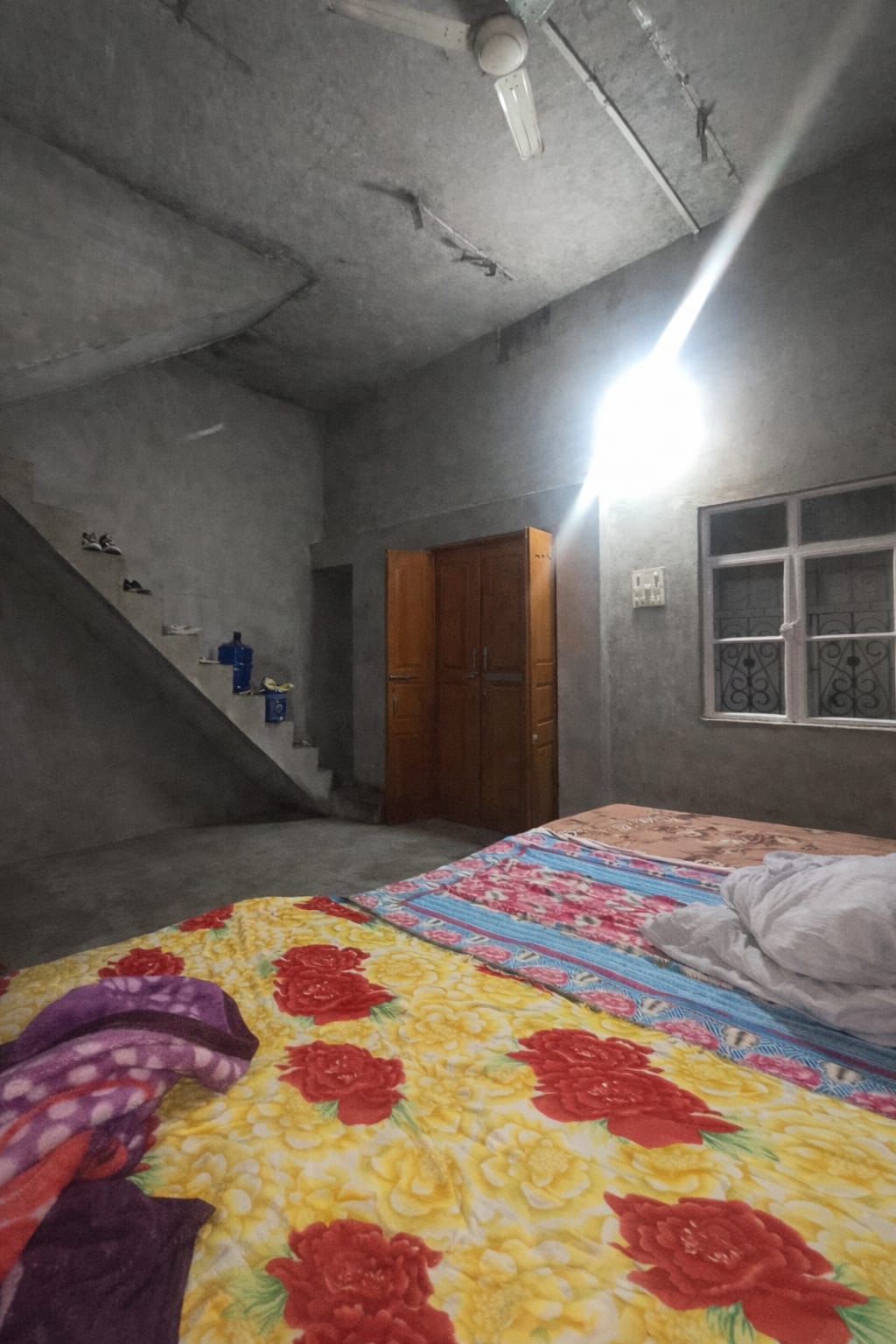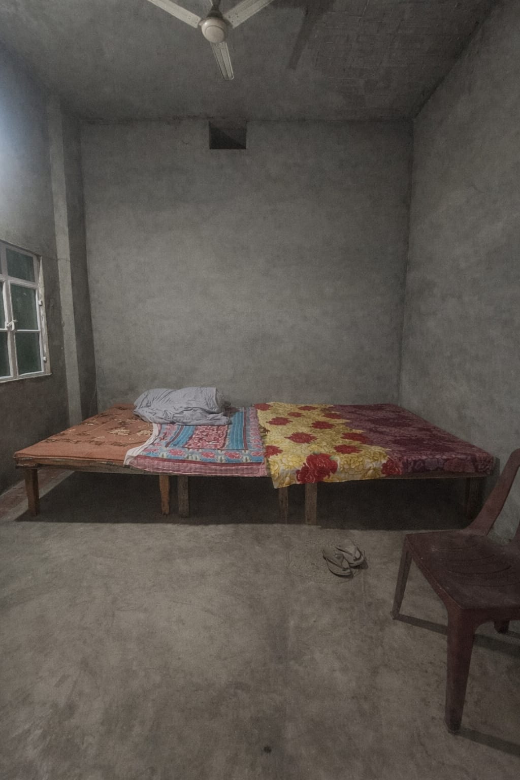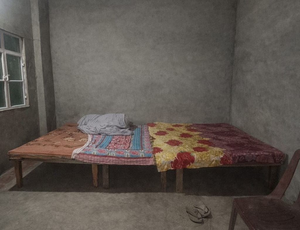Compact share room with fresh green walls, good ventilation, ceiling fan, and concrete flooring. Ideal for students or working professionals looking for a simple, affordable stay.