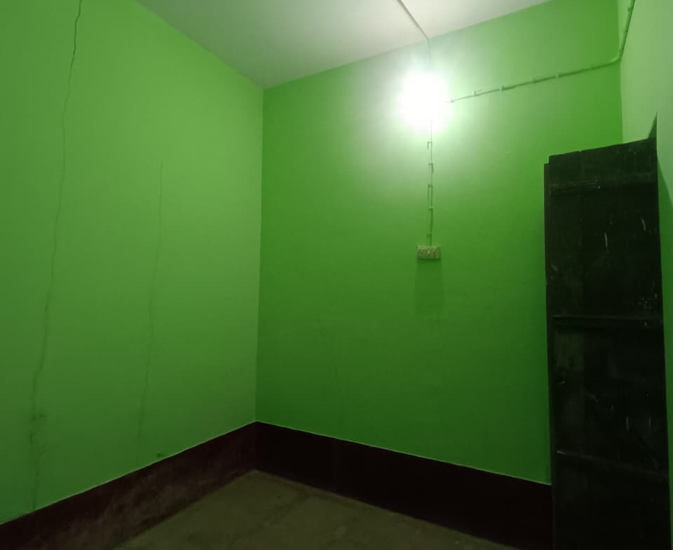 Compact share room with fresh green walls, good ventilation, ceiling fan, and concrete flooring. Ideal for students or working professionals looking for a simple, affordable stay